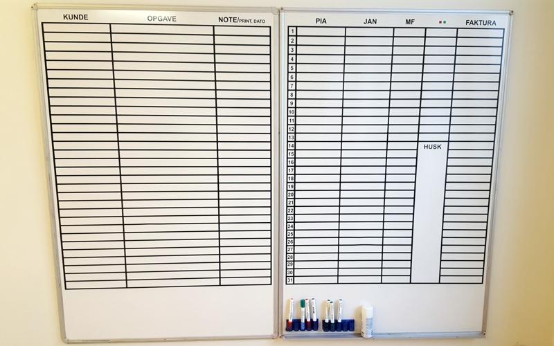 Vi kan beklæde dem med storformatprint eller udskåret folie som opdeling af whiteboardtavlerne. Folien er nem at montere hvis du har en whiteboardtavle der skal opdeles - du kan enten selv forsøge dig eller forhøre dig om prisen hvis vi skal montere det. Ønsker man en anden opdeling af tavlen kan folien pilles af og ny folie monteres efter grundig rengøring.